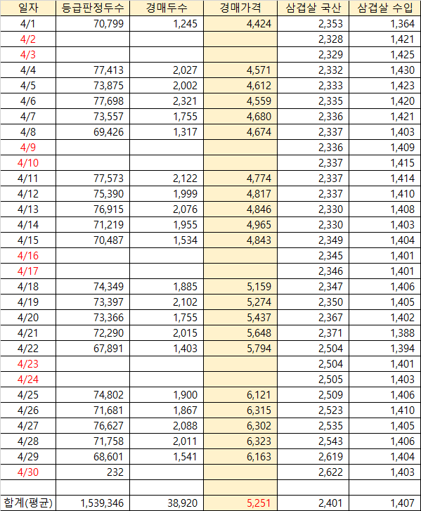※ 4월 4일자 주간 돼지고기 시황(출처 한국육류유통수출협회)
