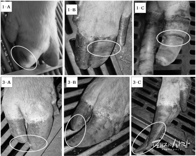구체적으로 국내 4개의 종돈장과 4개의 일반농장, 총 8개 농장 모돈을 대상으로 요크셔 263두, 랜드레이스 95두, 요크셔와 랜드레이스 교잡종인 F1 326두, 총 684두를 대상으로 발굽의 수평균열, 발굽의 수직균열, 발굽 끝 길이의 차이, 곁 발가락 길이의 차이를 관찰하고 평가하였다. 분만틀의 구조, 품종, 산차에 따른 발병률 및 발굽 병변별 발병 비율도 조사하였다.