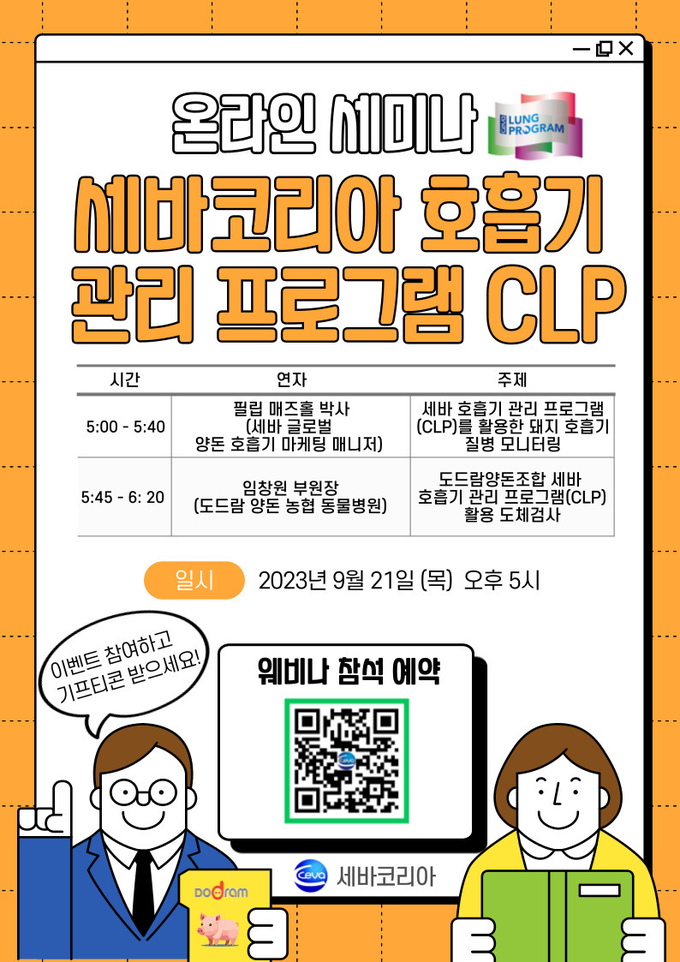 이번 웨비나에서는 CLP의 활용 방안과 함께 국내 적용 사례가 소개됩니다. 구체적으로 ▶CLP를 활용한 돼지 호흡기 질병 모니터링(필립 매즈홀, 세바 글로벌 양돈 호흡기 마케팅 매니저) ▶도드람양돈조합 CLP 활용 도체검사(임창원 부원장, 도드람 양돈농협동물병원) 등이 발표 예정입니다.