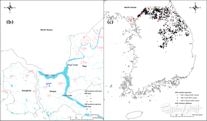 그런데 14개 균주는 'IGR II 변이주(IGRI73R-I329L II)'였습니다. 나머지 1개인 2023년 1월 22일에 보고된 ASFV 감염 돼지 농장(#31, 김포)의 균주의 경우는 'IGR I 변이주(IGRI73R-I329L I)'에 속합니다. 국내 양돈농장에서 IGR I 변이주가 확인된 것은 이번이 처음입니다. 앞서 2019년 12월 파주시 비무장지대 인근에서 발견된 야생멧돼지에서는 이미 IGR I(Korea/19S3965/wb/2019)과 III(Korea/19S5464/wb/2019)이 검출된 바 있습니다