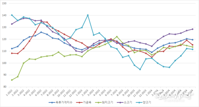 유엔식량농업기구(FAO)가 발표하는 8월 육류가격지수는 평균 119.5포인트로 7월보다 0.9포인트(0.7%) 하락했습니다. 지난 2월부터 상승한 가격이 드디어 꺾였습니다. 다만, 119.5포인트는 작년 대비 4.3포인트(3.7%) 더 높은 수준입니다.