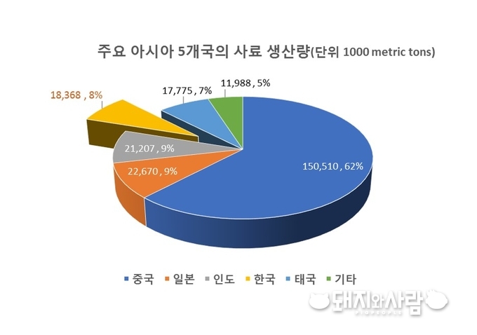 글로벌 사료 잡지 'Feed International'에 따르면 아시아 국가 중 중국이 사료 생산량에 있어 비교 불가할 정도의 압도적 1위로 나타났습니다. 전체 생산량 중 62%가 중국에서 생산되며 다음으로 일본과 인도로서 각각 9%를 차지했습니다. 한국은 4위로서 8%에 해당됩니다.