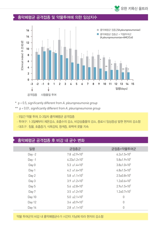 '키목신 울트라'는 농가에서 문제가 지속되고 있으면서 좀처럼 치료되지 않는 자궁내막염, 유방염, 폐렴, 괴사성폐렴, 위축성비염, 돈단독, 패혈증 등 질병에 감수성이 높은 아목시실린과 대장균증, 기관지성폐렴, 위축성비염, 살모넬라증, 유산 등을 치료하기 위한 콜리스틴을 복합 처방하여 강력한 상승효과를 보이는 광범위 항생제입니다.