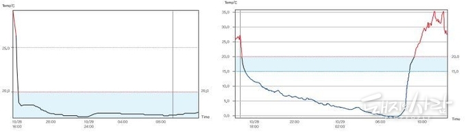 ② 중간: 내부 아이스팩과 같이 있던 데이터 로거의 온도는 급격하게 떨어졌다가 올라가는 외부온도와 비슷한 양상을 보이는 곡선을 그리고 있음