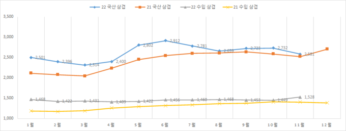 구이류 중 냉장육은 대형마트 할인행사 진행으로 판매가 원활한 편이었지만, 외식소비는 부진한 가운데 월드컵이 시작되며 이른 귀가로 더욱 위축되는 모습을 보였다. 냉동 삼겹살은 계속되는 판매부진으로 수요약세가 이어지고 있고, 목심만 강세 시장이 유지되고 있다. 목전지와 전지는 HMR 및 밀키트 등의 간편식 수요가 꾸준한 편이지만, 국가애도기간 이후 외식소비 위축으로 식자재로부터의 수요가 약세를 나타내며 가격이 하락을 보였다. 미국 시카고 선물가격은 11월 23일 현재 12월물이 1.85$로 전주대비 0.02$ 하락하였으며, 2월물은 1.96$로 0.04$ 하락, 4월물은 2.09$로 0.03$ 하락, 5월물은 2.18$로 0.02$ 하락하였다.