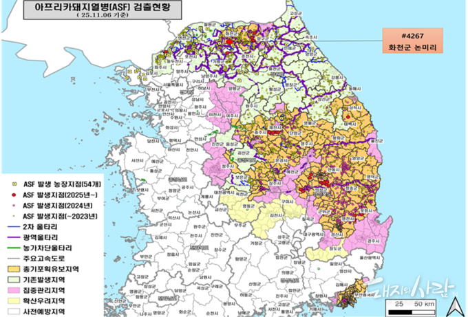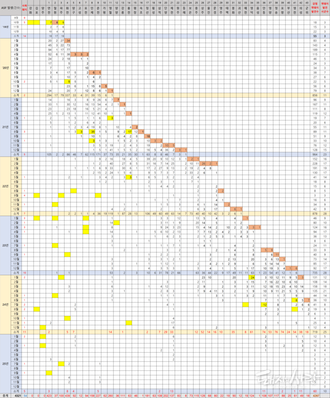 ▶ASF 발생현황 누적 4321건(일반돼지 54건/감염멧돼지 4267)/지도출처: ASF 중수본/환경부 국립야생동물질병관리원)