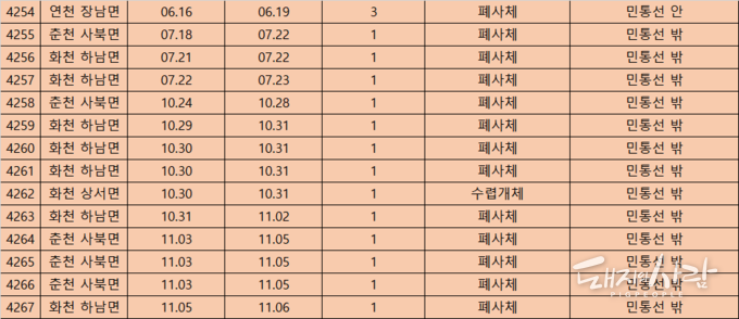 - 강원 19건: 화천 4(상서면/'20.10.9/10.10, 하남면/'23.09.25, 사내면/'24.10.13), 영월 1(주천면/'21.5.5), 고성 1(간성읍/'21.8.8), 인제 2(인제읍/'21.8.16, 남면/'21.10.6), 홍천 3(내촌면/'21.8.26, 화촌면/'22.5.26, 남면/'24.11.03), 양구 1(국토정중앙면/22.8.18), 춘천 2(동산면/22.9.19/9.20), 철원 4(동송읍/'22.11.09, 동송읍/'23.1.11, 갈말읍/'23.7.18/'24.5.21), 양양 1(손양면/'23.2.12)