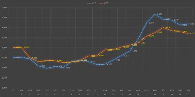 ☞2023년 주차별 평균 돈가('22년은 같은 기간)