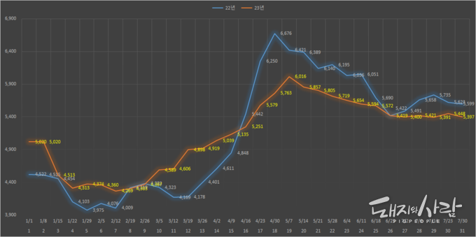 ☞2023년 주차별 평균 돈가('22년은 같은 기간)