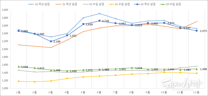 ☞2023년 주차별 평균 돈가('22년은 같은 기간)