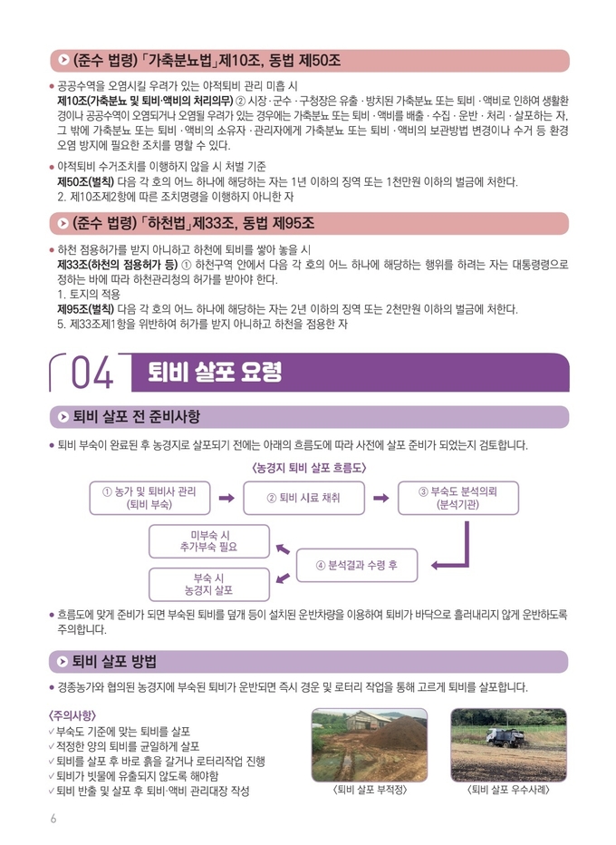 가축분뇨 퇴비가 야외에 방치되는 등 부적정하게 보관될 경우 퇴비로부터 발생된 영양물질(질소, 인 등 비점오염물질)이 빗물과 함께 하천에 유입되어 녹조 등 수질오염을 일으킵니다. 가축분뇨 퇴비관리는 깨끗하고 안전한 상수원 보호를 위해 무엇보다 중요합니다.