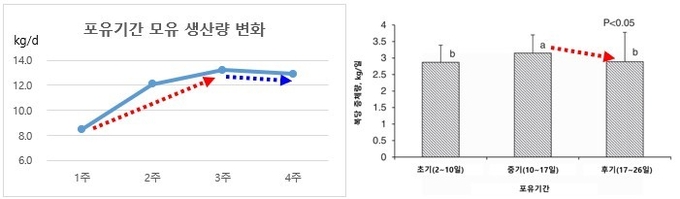 일반적으로 모돈의 모유 생산량은 분만 후 16~18일쯤 피크에 도달하며, 그 이후로는 점차 감소하는 경향을 보인다. 이에 따라 포유 후기에는 자돈에 영양이 부족하여 성장이 정체될 수 있다. 실제로 포유 기간을 초기(2~10일), 중기(10~17일), 후기(17~26일)로 분류했을 때, 후기 성장률이 중기보다 저하되는 결과를 확인할 수 있다.