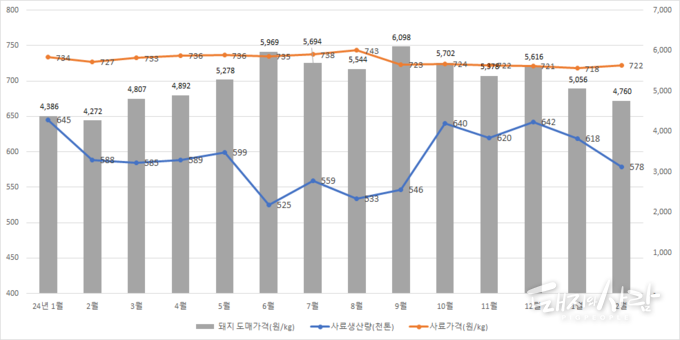 - '25년 3월 양돈용 배합사료 생산량 570천톤(전월대비 -1.4%, 전년대비 -2.4%)