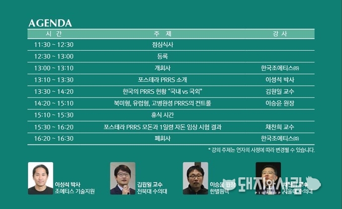 더불어 조에티스의 PRRS 백신인 '포스테라PRRS 백신(조에티스 이성석 박사)' 소개와 함께 최근 모돈 접종 허가와 자돈 1일령 접종 허가와 관련 시험 결과(서울대학교 채찬희 교수)도 공유될 예정입니다.