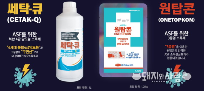 우리나라에는 ASF 소독제 관련 검역본부 추천 178여 개의 소독제가 있습니다만, 현재까지 실제 ASF 관련 검역본부 기준의 소독제 효력시험을 무사히 통과해 정식 품목허가를 받은 것은 '쎄탁-큐'와 '원탑콘' 두 제품이 유일합니다. 이들 제품은 미국 캔자스주립대학의 생물안전성연구소(BRI, Biosecurity Research Institute)에서 ASF 바이러스에 대한 소독제 효력평가를 수행하였습니다.