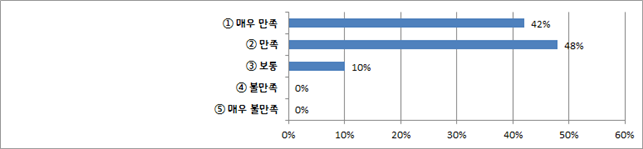 조사 결과, 응답자의 90%가 ‘만족한다’고 답한 것으로 나타났습니다. ‘보통이다’는 응답은 10%이며, ‘불만족’ 또는 ‘매우 불만족’이라고 답한 농가는 단 1곳도 없었습니다.