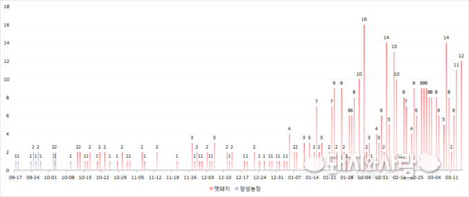 15일은 국내에 ASF가 첫 확진된지 180일이 되는 날 입니다. 현재 ASF는 야생멧돼지에서는 계속해서 파주·연천·철원·화천 등으로 확산되고 있어 일반농가에서의 재발병 가능성을 높여주고 있습니다.