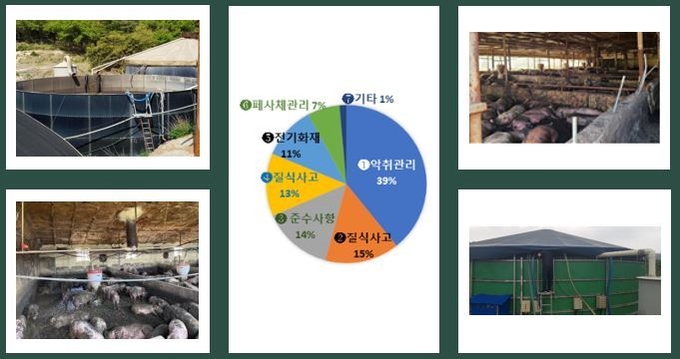 507건의 미흡 유형 분석 결과 악취저감시설 및 가축분뇨 관리 미흡 등 악취 관리 미흡이 199건(39.3%)으로 가장 많은 것으로 나타났습니다. 이어 ▶질식사고 예방 미흡 76건(15.0%), ▶청소 및 적정사육두수 준수 위반 72건(14.2%) ▶소독·방역 관리 미흡 65건(12.8%) ▶전기화재 안전관리 미흡 55건(10.9%) ▶폐사체 관리 미흡 33건(6.5%) ▶가축분뇨 유출 등 축산관련 법령 위반 7건(1.3%) 등 입니다.