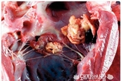 ▶ 비육돈 (경기 안성) ▶ 육안 소견 심내막염 발병 초기에는 체온이 40°C 정도로 상승하고, 호흡수와 맥박수가 증가한다. 시일이 경과되면 경정맥이 돌출되고 처음에는 턱밑에 부종이 생기며, 차차 목 아래로 내려가 흉부에 이르며 하복부까지도 파급된다. 부종이 심한 환축은 안면부까지 부어오르기도 한다.말기가 되면 이를 갈며 신음하는데, 신음소리는 야간에 더 심하다. 흉부를 타진해 보면 환축은 통증을 느껴 고통스럽게 신음한다. 따라서 피부온도가냉해지고, 신음하며 누워 있고, 식욕이 떨어졌다가 폐사한다. 육안소견은 심내막과 판막에 직경 1~2mm에서 수 cm에 달하는 물질이 다수 존재하며, 이러한 노란색, 적색조 병소는 얇은 혈전으로 덮여 있어 벗겨내면 쉽게 떨어진다. 또한 심내막과 판막 가장자리에 미란, 궤양이 발생하여 표면이 매우 약하고 만지면 쉽게 벗겨진다. ▶ 조직 소견 심내막과 판막부위가 두꺼워지고 결절 형태를 띠며, 점액종성 변성이 나타난다. 판막 내막은 괴사되어 여러 층의 섬유소로 덮여 있고 그 내부에는 세균 집락이 존재하며 주위에는 다수의 호중구, 단핵구가 침윤되어 있다. 병변 가장자리에 육아조직이 형성되고 시간이 지날수록 확장되는 것을 확인할 수