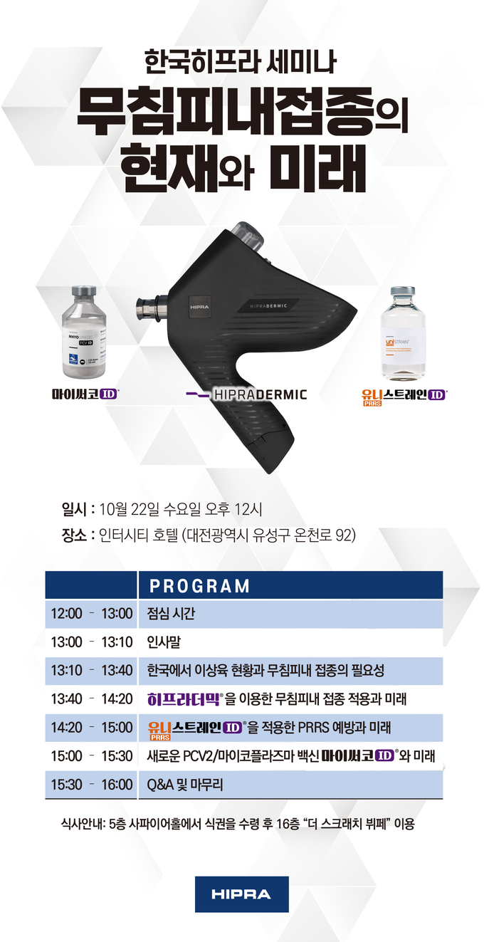 동물용의약품의 혁신을 선도하는 한국히프라(한국사업부문장 노상현)는 오는 22일(수) 대전 호텔인터시티에서 ‘무침피내접종의 현재와 미래’라는 주제로 자사의 최첨단 무침피내접종 기술을 집중 조명하는 세미나를 개최합니다.