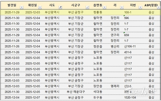 기후에너지환경부 자료에 따르면 검사는 정확히 지난 3일 실시되었습니다. ASF 바이러스는 검출되지 않았습니다. 참고로 지난 1일부터 7일 사이 검사한 부산 야생멧돼지 시료는 모두 16건이며, 역시 모두 같은 음성 결과입니다. 전국의 다른 지역도 마찬가지 결과입니다.