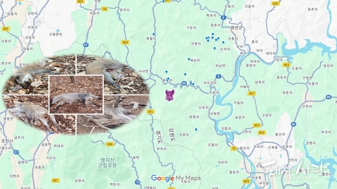 보름 만에 ASF 감염멧돼지 5마리가 한꺼번에 추가되었습니다. 이달 첫 사례입니다. 국립야생동물질병관리원에 따르면 해당 멧돼지는 지난 10일 강원도 화천군 사내면 용담리 소재 야산에서 수색 과정을 통해 폐사체로 발견되었습니다. 5마리 모두 12개월령 이상의 성체로 폐사한지 10일에서 30일이 경과된 것으로 파악되었습니다. 11일 정밀검사 결과 양성으로 확진되었습니다(#4291-5). 이로써 지난 10월 28일 이래 ASF 감염멧돼지 발견숫자는 모두 38마리(화천 29, 춘천 8, 원주 1)로 늘어났습니다. 한편 지난달 ASF가 확진된 충남에서는 아직까지 감염멧돼지 또는 바이러스 오염원이 발견되지 않고 있습니다.