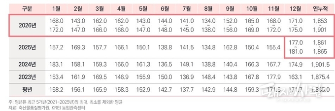 농경연은 "(내년) 공급 증가로 전년 대비 도매가격이 낮아지더라도, 가공용 원료육 공급이 평년보다 줄어 평년 수준보다는 높은 흐름을 보일 것"이며, "기간별로는 2025년 대비 상반기 상승, 하반기 하락할 것"이라고 밝혔습니다.