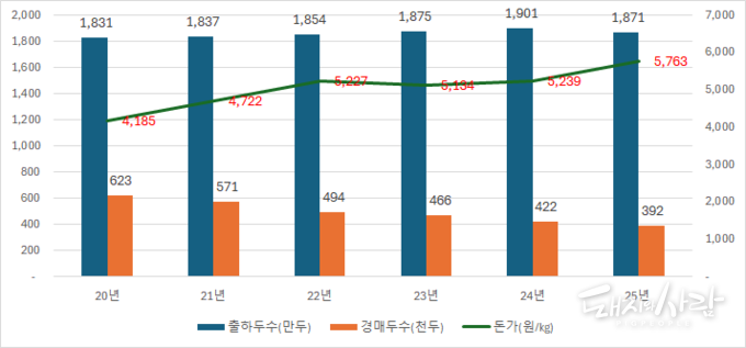또한, 지난해 경매두수(제주 및 등외 제외)는 39만 두로 집계되었습니다. 지난 '22년 49만4천두, '23년 46만6천두, '24년 42만2천두에 이어 뚜렷한 감소세를 이어나가더니 마침내 40만두대가 붕괴되었습니다. '18년 76만2천두의 거의 절반 수준으로까지 떨어졌습니다. 지난해 경매두수 감소율(-7.2%)은 출하두수 감소율(-1.6%)을 압도했습니다. 경매두수 감소는 도매가격 상승을 유발합니다.