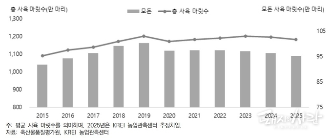 - 2025년 돼지 평균 사육 마릿수는 전년(1,194만 마리) 대비 1.0% 감소한 1,182만 마리로 추정된다.