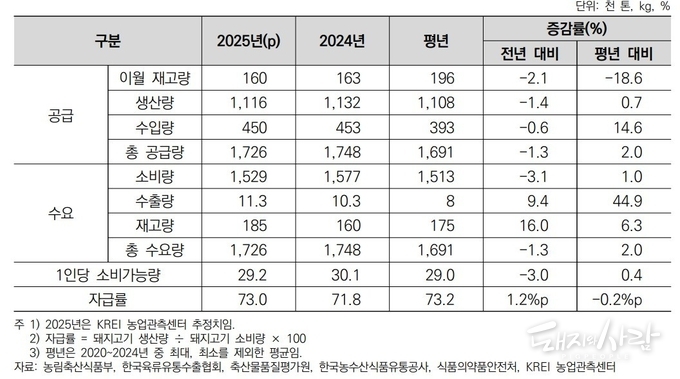 - 2025년 돼지고기 총 공급량은 생산량과 수입량 감소로 전년 대비 1.3% 감소한 172만 6천 톤으로 추정된다. 2025년 1인당 소비가능량은 전년 대비 3.0% 감소한 29.2kg으로 추정된다. 2025년 돼지고기 자급률은 전년 대비 1.2%p 상승한 73.0%로 추정된다.