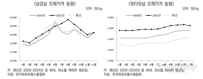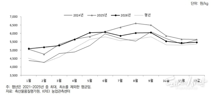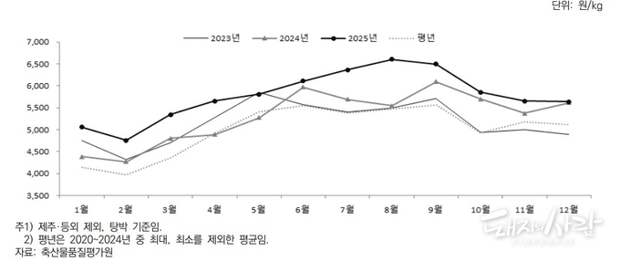 - 2025년 평균 지육 도매가격은 공급량 감소와 수요 증가로 전년 대비 10.0% 상승한 5,763원/kg이었다.