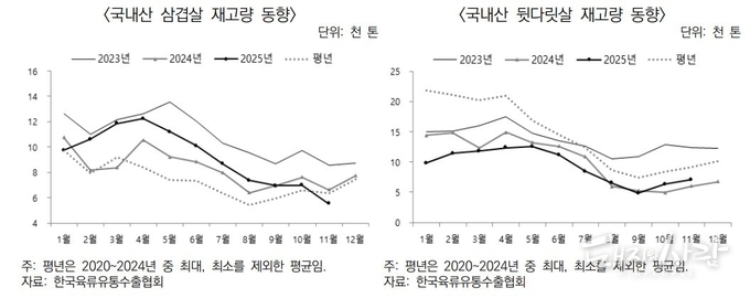 - 2025년 평균 도매가격은 전반적으로 도축 마릿수가 감소한 가운데, 국내산 뒷다릿살 재고 량이 부족한 상황이 지속되면서 전년보다 높은 수준에서 형성되었다. 2025년(1~11월) 뒷다릿살 재고량은 전년 대비 평균 6.3%, 평년 대비 평균 33.7% 감소했다. 반면, 삼겹살 재고량은 전년 대비 평균 10.3% 증가, 평년 대비 평균 25.6% 증가했다.