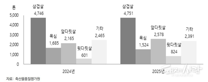 - 선호하는 부위는 삼겹살로 나타났으며, 앞다릿살/뒷다릿살 비중도 6.4% 나타나 저렴한 부위에 대한 선호도가 전년보다 증가한 것으로 판단된다(2025년 앞다릿살/뒷다릿살 선호도 비중은 2024년 대비 2.0%p 증가함).