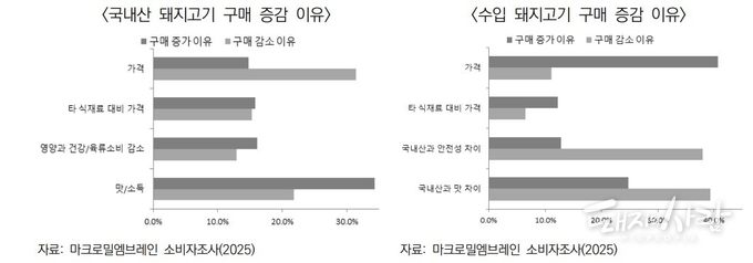 - 국내산 돼지고기 구매 증가 이유로는 ‘맛이 좋아서’가 39.5%로 가장 많았으며, 구매 감소 이유로는 ‘가격이 비싸서’가 28.8%로 가장 많았다.