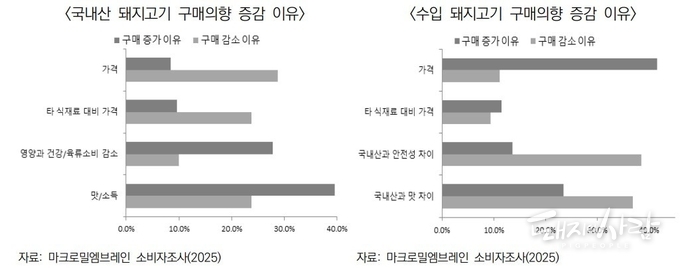 - 2025년에 국내산 돼지고기 구매를 전년보다 늘린 응답자는 34.2%였으며, 구매 증가 이유로는 ‘맛이 좋아서’라는 응답이 가장 높은 순위로 나타났다.