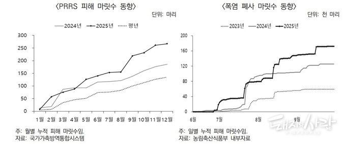 - 2025년 하절기 폭염에 의한 돼지 폐사 마릿수는 전년 대비 37.1% 증가한 17만 2천 마리 수준이었다. 2025년에는 이른 폭염의 영향으로 7월부터 폐사 마릿수가 증가했으며, 장마 기간에는 일시적으로 소강상태를 보였으나 8월 중순 이후 다시 증가하였다.