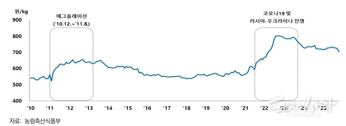 - 2025년(1~11월) 돼지 배합사료 평균 가격은 전년 동기 대비 1.0% 하락한 725원/kg이었다. 돼지 배합사료 가격은 국제곡물 공급 차질로 2022년 800원대까지 상승한 이후, 공급 여건이 안정되면서 하락세를 보였다.