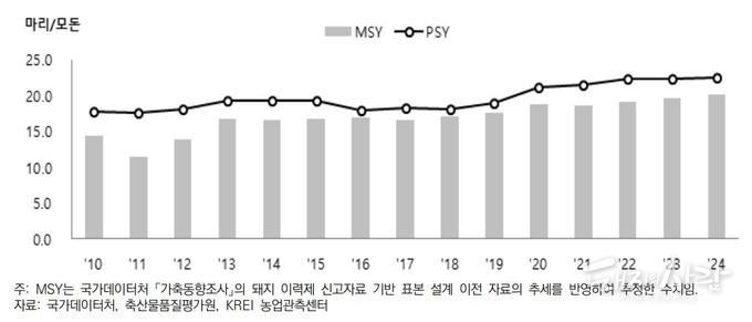 - MSY는 2010년 14.3마리에서 2020년 18.8마리, 2024년 20.1마리로 증가했고, PSY는 2010년 17.8마리에서 2020년 21.2마리, 2024년 22.5마리로 증가했다. 2025년은 질병과 폭염의 영향으로 생산성 상승 폭이 둔화된 것으로 추정된다.