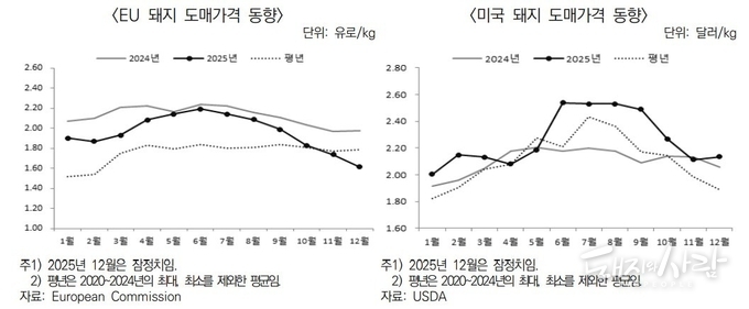 - 2025년 EU 돼지 도매가격은 생산량 증가와 수출 수요 감소로 전년 대비 7.7% 하락한 1.96유로/kg로 추정된다.