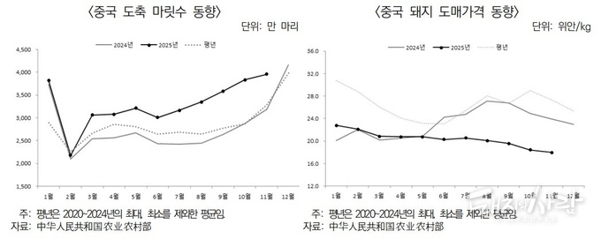 - 2025년(1~11월) 중국 돼지 도매가격은 생산량 증가로 전년 대비 12.3% 하락한 20.4위안/kg이었다. 2025년(1~11월) 도축 마릿수는 사육 조절을 위한 출하 가속화로 전년 대비 22.4% 증가한 3억 6,246만 마리였다.
