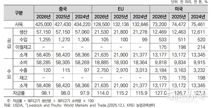 - 2026년 세계 돼지고기 생산량은 EU의 생산량 감소에도 불구하고, 미국과 중국의 생산량이 전년 수준을 유지하고 기타 국가의 생산량 증가가 이를 상쇄하면서 전년과 유사한 1억 1,573만 톤으로 전망된다.