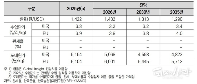 - 2026년 미국산 돼지고기 도매원가는 전년 대비 1.7% 하락한 5,068원/kg으로 전망되며, EU산 돼지고기 도매원가는 전년 대비 1.7% 하락한 6,001원/kg으로 전망된다. 환율 변동 수준에 따라서 수입 돼지고기 도매원가는 조정될 수 있다.