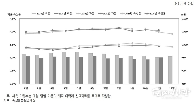 - 2025년 11월 말 기준, 돼지 사육 마릿수(이력제)는 전년 수준인 1,194만 5천 마리였다.
