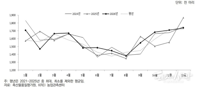 - 2025년 7~8월 자돈 사육 마릿수와 9~10월 육성돈 사육 마릿수가 전년 대비 감소하여, 2026년 상반기 일평균 도축 마릿수는 전년 대비 감소할 것으로 전망된다.