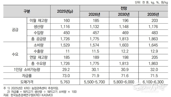 - 돼지고기 수입량은 국제 돼지고기 가격하락으로 완만한 증가 추세를 보이며 2030년에 46만 9천 톤, 2035년에 48만 3천 톤까지 증가할 전망이다. 장기적으로 수입량이 증가하면서 돼지고기 자급률은 2030년 71.6%, 2035년 71.5%로 전망된다.