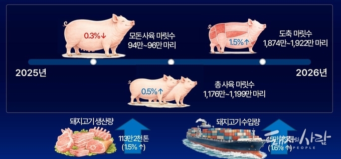 - 2026년 평균 돼지 사육 마릿수는 전년 대비 0.5% 증가한 1,176만~1,199만 마리로 전망되며, 평균 모돈 사육 마릿수는 전년 대비 0.3% 감소한 94만~96만 마리로 전망된다.