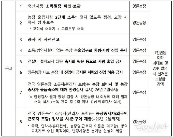 - (공고) 7번 전국 양돈농장 소유자(관리자 포함)는 농장 퇴비사 및 농장 종사자 물품·숙소에 대해 환경검사 실시(~26년 2월까지)