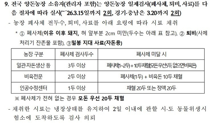 - (공고) 9번 전국 양돈농장 소유자(관리자 포함)는 양돈농장 일제검사(폐사체, 퇴비, 시료)를 소정의 절차에 따라 실시(~’26.3.15일까지 2회, 경기·충남은 3.20까지 2회)