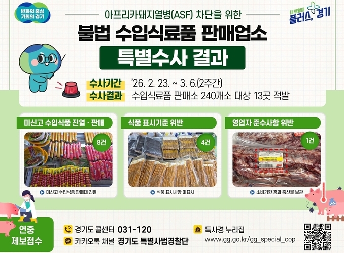 경기도가 아프리카돼지열병(ASF)의 국내 유입과 확산을 차단하기 위해 실시한 특별수사에서 불법 수입식품을 판매한 업소 13곳이 적발됐습니다.