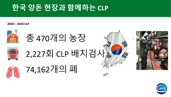 이런 점에서 CLP는 매우 의미 있는 도구가 될 수 있다. CLP는 도축장에서 폐병변을 정량적으로 평가해 농장의 호흡기 건강 상태를 수치로 보여주는 프로그램이다. 특히 흉막폐렴 유사 병변의 발생률과 병변 정도를 함께 반영함으로써 농장 상태를 보다 객관적으로 비교할 수 있게 해준다. 단순히 폐가 좋다, 나쁘다는 인상적 판단을 넘어, 어느 정도 수준의 문제가 반복되고 있는지를 데이터로 확인할 수 있다는 점에서 활용 가치가 크다. 실제로 유럽의 대형 양돈조합에서는 CLP를 돈군 건강 관리를 위한 핵심 도구 중 하나로 활용하고 있다.
